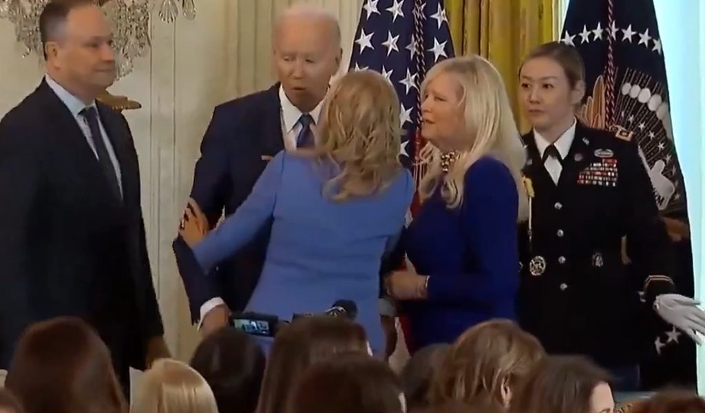 目の前の女性を自分の妻だと思い込み、キスしようとしたバイデン氏。しかし、後からやって来た本物の妻、ジル・バイデンに制止されるという一幕がありました。